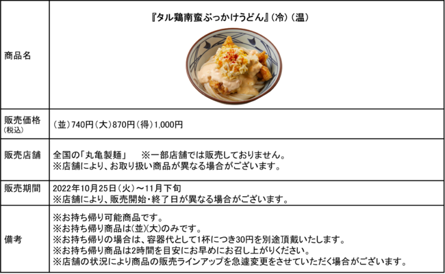 株式会社丸亀製麺(本社:東京都渋谷区、代表取締役社長:山口 寛)が展開する讃岐うどん専門店「丸亀製麺」は、『うま辛担々うどん』『タル鶏南蛮ぶっかけうどん』を2022年10月25日(火)から期間限定で全国の丸亀製麺にて販売いたします。また路面店を中心に一部店舗にて『肉ごぼう釜玉うどん』を販売いたします。