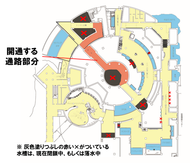 今回の開通によって順路が平常通りに戻りますが、トンネル水槽は水を抜いた状態、ビワコオオナマズ水槽とコアユ水槽は閉鎖状態のままです。また、他にも水を抜いている水槽がありますが、別に水槽を設置して展示しています。生き物の展示種数は閉鎖以前とほぼ同じです。