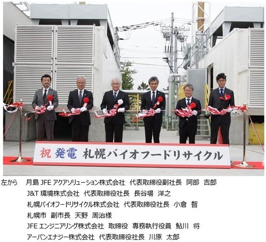 札幌バイオフードリサイクル株式会社(社長:小倉 智、本社:北海道札幌市、以下「札幌バイオフードリサイクル」)は、札幌市において食品リサイクル発電プラントの更新および処理能力拡大を目的に新工場の建設を進めており、このたび新工場での業務開始に伴い5月15日発電式を執り行いました。新工場は北海道内最大の食品バイオガス発電施設*1で、JFEエンジニアリンググループのJ&T環境株式会社(社長:長谷場 洋之)では、本拠点もあわせて全国6カ所で食品リサイクル発電事業*2を行っています。