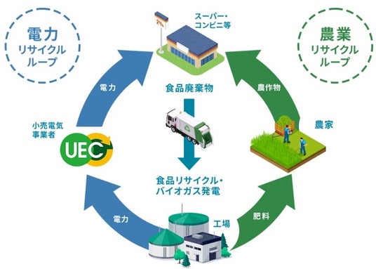新工場では、食品廃棄物を微生物の力で発酵させ、発生するメタンガスを燃料にして発電を行います。発電出力は1,980kW、年間想定発電量は約16,420MWh(一般家庭約4,560世帯分の年間使用電力量に相当)です。また、発電された電力は、FIT(固定価格買取)制度を活用するとともに、JFEエンジニアリングの電力小売事業子会社であるアーバンエナジー株式会社(UEC)(社長:川原 太郎、本社:神奈川県横浜市)を通じて売電され再生可能エネルギーの地産地消を目指します。さらに、処理過程で発生した発酵残渣は全量肥料化を進めます。これにより、食品廃棄物をクリーン電力と肥料へ転換する地産地消型の “ダブルリサイクルループ“を実現していきます。