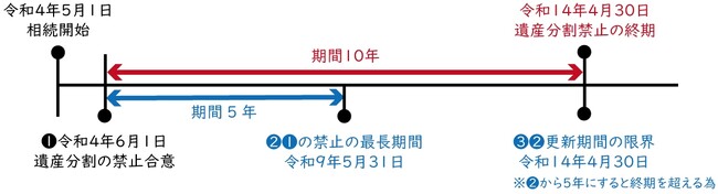 期間の終期は相続開始の時から10年を超えることができません。この期間内であれば5年以内の期間で更新することができます。これは何か文章で読むとよく分からないですね・・・このような感じになります▼(下記図)
