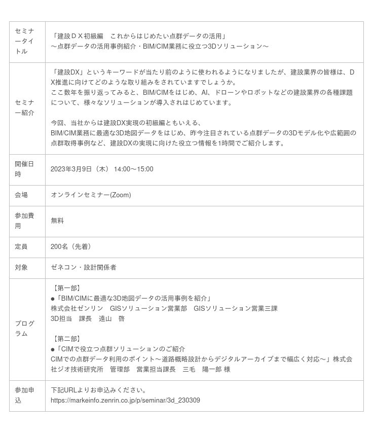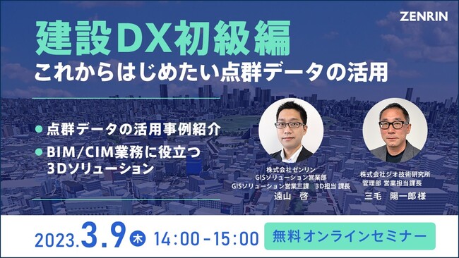 株式会社ゼンリン(本社:福岡県北九州市、代表取締役社長:高山善司、以下 ゼンリン)は、2023年3月9日(木) 14時より、「建設DX初級編 これからはじめたい点群データの活用」~点群データの活用事例紹介・BIM/CIM業務に役立つ3Dソリューション~と題してオンラインセミナーを開催します。