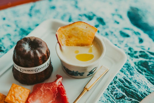 シャルキュトリとは加工肉全般のことを指すフランス語で、フランスの伝統的な食文化の一つです。KURAMAE CANNELEのシャルキュトリは、自家製のジャンボンブランをご用意しました。ジャンボンブランとは「ジャンボン=もも肉」「ブラン=白」を表し、茹でた豚のハムのことを指します。今回は岩手県の白金豚の腕肉を使用しました。かためで歯応えのある腕肉は、旨みをより感じることのできるハムにぴったりです。ぜひプレミアムカヌレ「グランカヌレ」に巻いてお召し上がりください。