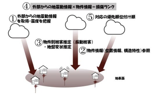 1.地震動情報(ある地点での震度:計測震度相当値)をインターネット経由で取得し、50mまたは250mメッシュごとの震度を把握(50mメッシュ適用エリアは南関東の一部)