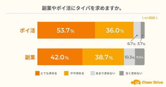 副業やポイ活にタイパを求めているかそれぞれ尋ねたところ、ポイ活に対しては約9割、副業に対しては約8割がタイパを求めていることがわかりました(n=300)。