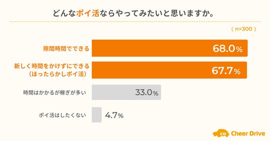 株式会社チアドライブ(本社:東京都中央区、代表取締役社長:保科昌孝、 http://cheerdrive.jp/ )は、自家用車を運転することのある20~40代の男女を対象に「ポイ活や副業に関するアンケート」を実施し、300名から回答を得ました。