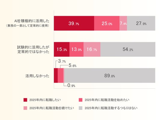 - AI積極活用層は過半数以上が2024年に転職したり、転職活動を始めたもしくは進めている中、「活用しなかった」層の8割弱が「転職の意向はなかった」と回答