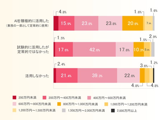 現在の年収については、「非公開または回答したくない」を除いた年収別の割合において、「AIを積極的に活用した」層は600万円以上が過半数であるのに対し、「活用しなかった」また「試験的に活用したが、定常的ではなかった」層は600万円未満が60%を超えており、「AIを積極的に活用した」層の方が年収が高い傾向にあることがわかりました。