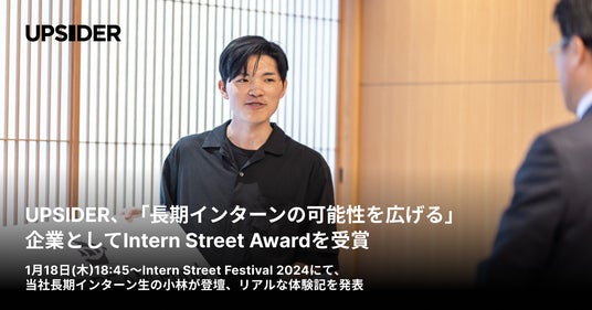 「挑戦者を支える世界的な金融プラットフォームを創る」をミッションに、法人カード「UPSIDER」をはじめとする金融サービスを提供する株式会社UPSIDER(代表取締役:宮城徹・水野智規、本社:東京都港区、以下 当社)は、スローガン株式会社が主催する「Intern Street Award」を受賞いたしました。受賞に伴い、1月18日(木)開催の「Intern Street Festival 2024」に、当社で長期インターン生として活躍する小林が登壇し、リアルな体験談をお話しします。長期インターンシップについて検討している学生の皆さま、ぜひご参加ください。