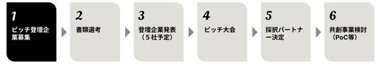 本プログラムでは、NTT西日本グループのアセットと応募企業のイノベーティブなプロダクトなどを組み合わせた事業共創をめざします。エントリーいただいた企業から、NTTBSにて書類選考を実施し、通過した企業(5社予定)によるピッチを実施します。その中から、NTTBSの事業との共創親和性が高い事業アイデアを採択し、共創検討を実施します。共創にあたっての実証実験予算等は、必要に応じてNTTBSにて負担します。また、採択パートナーの要望に応じてNDVが出資を検討します。