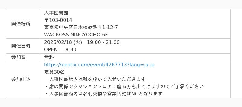 2024年4月1日に東京人形町にオープンした、人事関連職が集まるコワーキング×コミュニティ。2500冊以上の人事に関する書籍と600名以上の会員を有しており「仲間と学びで、未来を拓く」をタグラインに運営している。