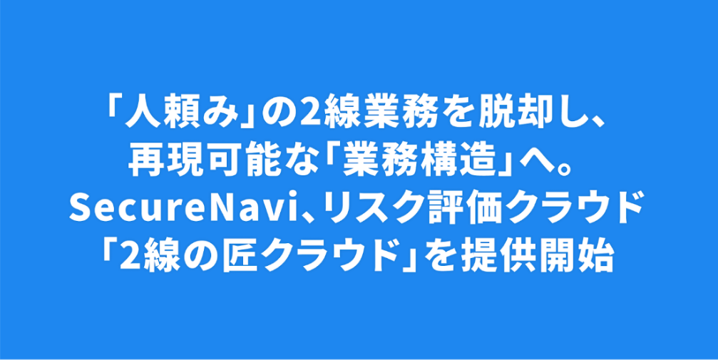 情報セキュリティ認証や規制、ガイドラインへの準拠、社内の情報セキュリティ規程の整備・運用、監査や審査などの「文系のセキュリティ」領域をDXするSecureNavi株式会社(本社:東京都港区、代表取締役CEO:井崎友博)は、2線部門(セキュリティ・リスク管理・コンプライアンス)のためのセキュリティリスク評価クラウド「2線の匠クラウド」を、本日より正式リリースしたことをお知らせします。