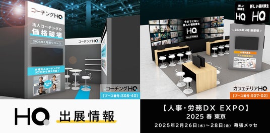 EX(従業員体験)プラットフォームを提供する株式会社HQ(読み:エイチキュー、本社:東京都港区、代表取締役:坂本祥二)は、2月26日(水)~28日(金)の期間に幕張メッセで開催される【人事・労務DX EXPO 2025 春 東京】に、2月13日にリリースしたばかり本格法人コーチング「コーチングHQ」を初出展いたします。また、2024年4月に提供を開始した国内初・AI活用の福利厚生プラットフォーム「カフェテリアHQ」も同時出展いたします。
