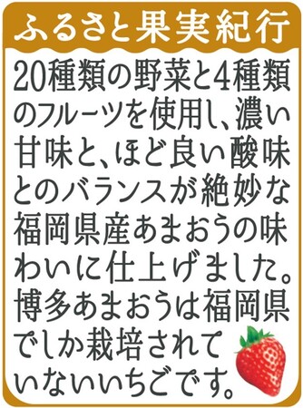 「野菜生活100 濃厚果実 博多あまおうミックス」は、濃い甘味と、ほど良い酸味とのバランスが絶妙な福岡県産あまおうの味わいの野菜&果実100%ミックスジュースです。あまおうの名前の由来は、「あ」かい・「ま」るい・「お」おきい・「う」まい。「甘い王様になれるように」という意味が込められています。おやつ・デザートタイムやリラックスシーンにおすすめです。