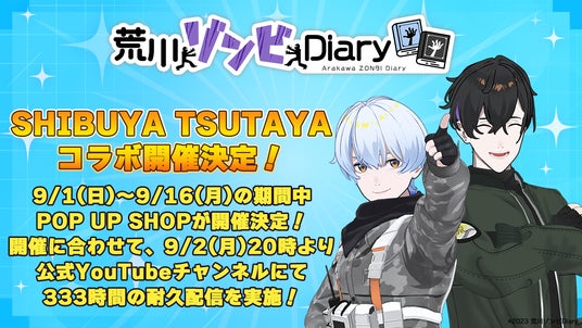 また、POP UP SHOP開催に合わせて、9月2日(月)20時~9月16日(月/祝)16時までの期間、『荒川ゾンビDiary』のシモンとカムイが、YouTubeによる333時間に及ぶ長時間生配信「シブツタ耐久Diary」を行い、ギネス記録に挑戦します!