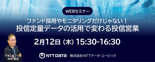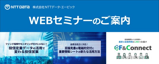 株式会社NTTデータ・エービック(本社:東京都港区、代表取締役社長 大谷 温仁、以下「当社」)、金融機関様の投資信託販売を支援する当社サービスに関するWEBセミナーを随時開催しています。2月は、3つのWEBセミナーを開催します。