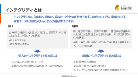 研修のスタイルにとらわれない企業向け人材育成サービスを提供する株式会社LDcube(本社:東京都千代田区、代表取締役社長:新井澄人、以下「当社」)は、「コンプライアンス違反を防ぐ!インテグリティー向上で実現する、健全な組織づくり」と題してウェビナーを開催しますので、お知らせします。