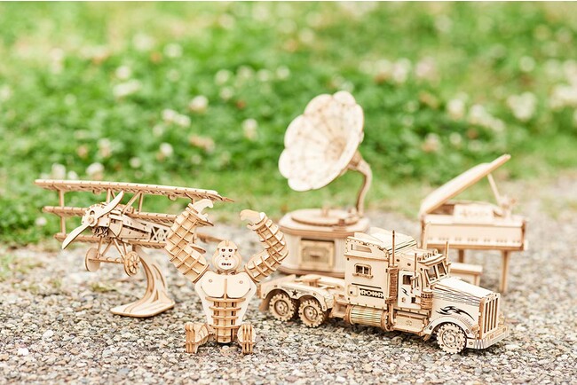 会場では、たくさんのつくるんです(R)商品がお出迎え。ウッドパズル、ミニチュアハウス、ブラインドボックスのナンシー・ユーラも大集合。なかなか見ることのない地球儀や蓄音機など、大型のウッドパズルに、参加者のみなさんは興味津々でした。