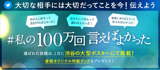 応募方法:1.「@hyakumankai_tbs」をフォロー 2.「#私の100万回言えばよかった」をつけてツイート