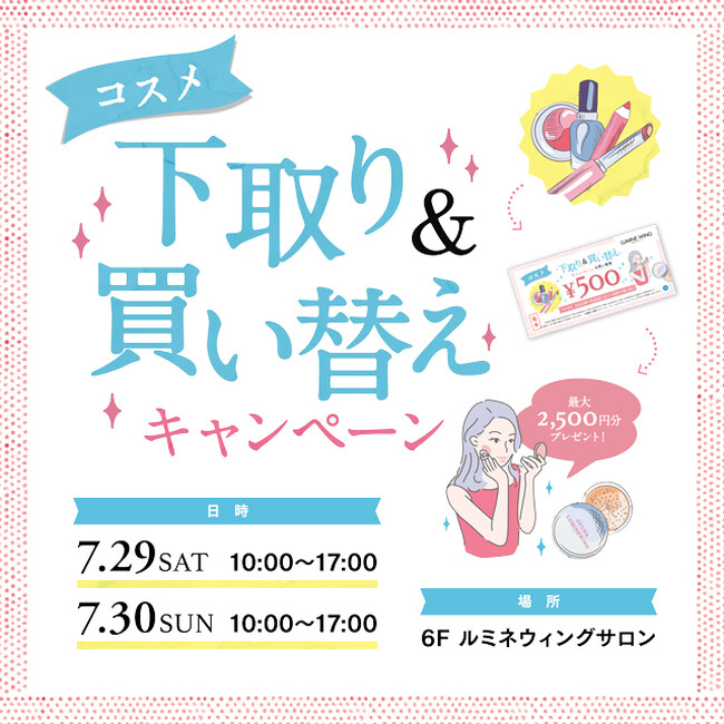 2日間限定でコスメの下取りイベントを開催します。ご不要になった化粧品を1点お持ちいただくと、500円分のお買い物券を1枚プレゼント。※お一人さま最大5枚まで(諸条件有)