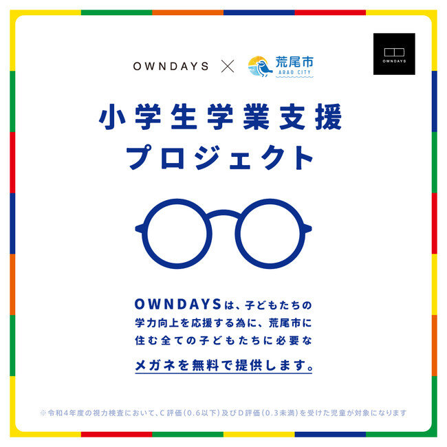 メガネ・サングラスの製造販売を手掛けるOWNDAYS株式会社(本社:沖縄県那覇市、代表取締役社長:田中修治)は、荒尾市に住む小学生に向けて、学校で実施する視力測定で視力矯正が必要と判断された児童を対象に、メガネの無償提供(年1回)を2023年4月から実施します。提供するメガネは、アレルギーや安全への配慮として金属部品を極力使用せず、曲げても壊れにくい樹脂製素材を使用したフレームを、年齢に合わせて数サイズ用意しています。使用するレンズは全て国内有名メーカー製の薄型非球面レンズ(1.60~1.74)で、UVカットが標準搭載されています。本取り組みは、小学校を卒業するまでの間、年1回受け取ることができるようになっており、今後も継続的に行なっていく予定です。