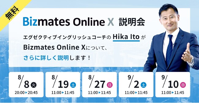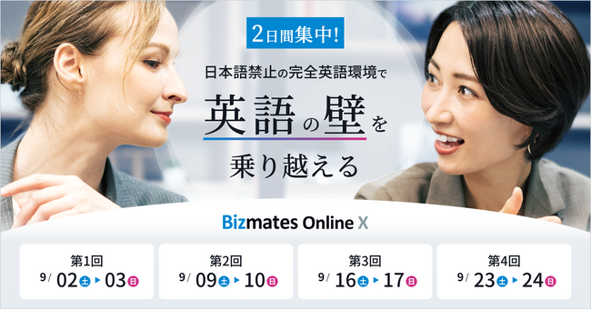 ビジネス特化型オンライン英会話事業「Bizmates」(https://www.bizmates.jp/)を展開するビズメイツ株式会社(東京都千代田区、代表取締役社長:鈴木 伸明 、以下「当社」と言う。)は、2023年9月2日(土)より2日間でビジネス英語を学習するオンライン開催の“グローバルビジネス実戦プログラム“『Bizmates Online X』(ビズメイツオンラインエックス)(以下「当プログラム」と言う。)を計4回提供いたします。