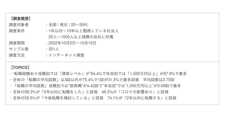 Job総研では351人の社会人男女を対象に、年収や役職区分別を含めた転職経験の有無やその回数、またコロナ情勢が影響した転職率や今後の転職予定及び動き出す時期などについて調査した「2022年 転職の実態調査」を実施しました。