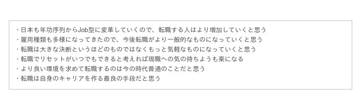 転職についてポジティブな意見や今後の転職市場への言及が顕著に見られました