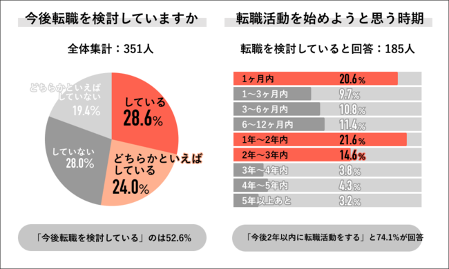 今後転職を検討しているかについて聞くと、「検討している」28.6%と「どちらかといえばしている」24.0%を合算した52.6%が”検討している派”の回答をしました。”検討していない派”の回答は47.4%でした。また”検討している派”を回答した185人にその時期を聞くと、「1~2年内」が21.6%で最多回答になり、次いで「1ヶ月内」が20.6%、「2~3年内」14.6%で上位3つの回答で、「1年内」は全体の52.5%でした。