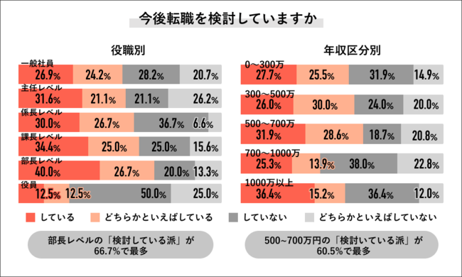 今後の転職について役職別で見ていくと、”検討している派”の回答で最多だったのは66.7%の「部長レベル」で、次いで「課長レベル」が59.4%、「係長レベル」が56.7%で、中間管理職が上位3つを占める結果になりました。またこれを年収区分別で見ていくと、”検討している派”の回答で最多だったのは60.5%の「500~700万円未満」で、次いで「300~500万円未満」が56.0%、「300万円未満」が53.2%で上位3つの結果になりました。