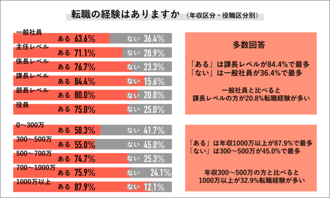 またこれを年収区分別で見ていくと、「1,000万円以上」が87.9%で最多になり、次いで「700~1,000万円未満」が75.9%、「500~700万円未満」が74.7%と年収が高い順に”転職経験あり”の回答が高くなる結果になりました。
