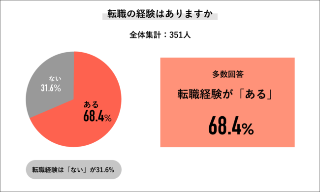 転職経験の有無では全体の68.4%が「経験あり」と回答しました。これを役職別で見ていくと、転職経験ありの最多回答は84.4%の「課長レベル」で、次いで「部長レベル」が80.0%、「係長レベル」が76.7%と中間管理職の転職経験が上位3つを占める結果になりました。