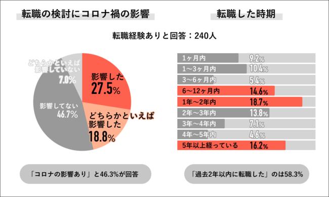 また近年では大転職時代と言われ、転職が一般化したことから転職経験のある人が増加している傾向にある中、2020年から始まったコロナ禍の影響を受けて転職をした人が46.3%になり、転職をした時期でも「過去2年内」が58.3%と過半数がコロナ禍で転職をしたという結果になりました。