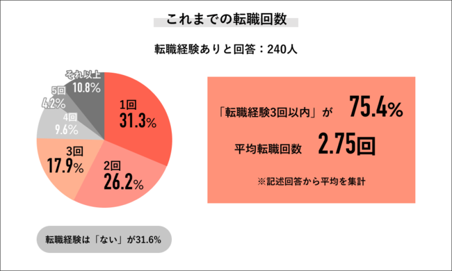 これまでの転職回数では「1回」が最多の31.3%で、次いで「2回」が26.2%、「3回」が17.9%で上位3つの回答になり、合算した”3回以内”の回答は75.4%の結果になりました。4回以上は24.6%で、そのうち6回以上と回答したのは10.8%でした。