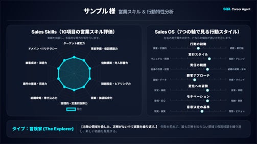 ミスマッチの根源を解消するため、求職者の現在地と企業の求める要件を「Sales Profile(条件)」「Sales Skills(10項目の実務スキル)」「Sales OS(7項目の志向性・カルチャー)」の3階層で分析します。そのうえで、10項目の「Sales Skills」と7項目の「Sales OS」、さらに分析結果から導き出される「16タイプの適性診断」を独自の『セールスバイタルシート(TM)』として可視化します。自身のスキルと適性が数字と言葉で手元に残り、面接でも転職後も活きる確かな“資産”となります。