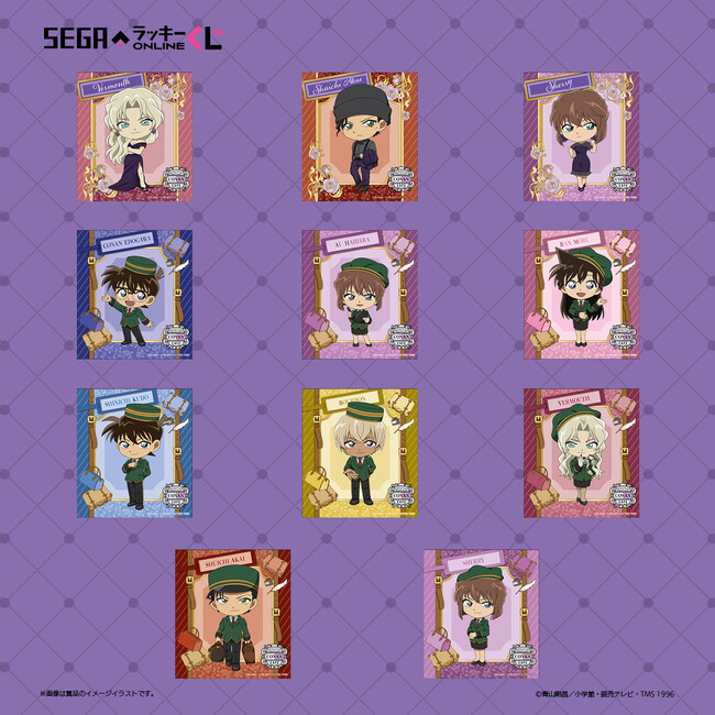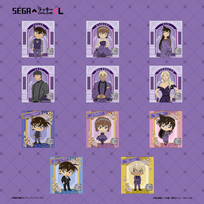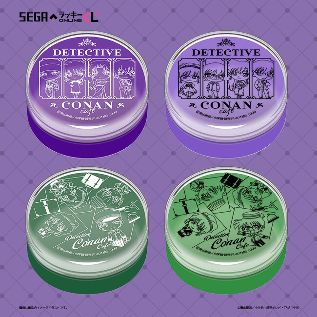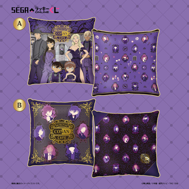 「名探偵コナンカフェ」は、大ヒット上映中の「劇場版『名探偵コナン 黒鉄の魚影(サブマリン)』」を記念して、全国7都市10会場にて開催されているテーマカフェです。カフェのメインビジュアルである、ヴァイオレットとブラックの衣装を身にまとったキャラクターたちの描き下ろしイラストをモチーフとして、「セガ ラッキーくじオンライン」では賞品を多数ご用意いたしました。