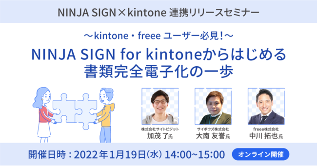 ワンストップ電子契約サービス「NINJA SIGN by freee」(以下、NINJA SIGN)を提供する株式会社サイトビジット(本社:東京都千代田区、代表取締役:鬼頭政人)は、サイボウズ株式会社(本社:東京都中央区、代表取締役社長:青野慶久)およびfreee株式会社(本社:東京都品川区、CEO:佐々木大輔)と3社共催で、無料オンラインセミナー「NINJA SIGN for kintoneからはじめる書類完全電子化の一歩」を2022年1月19日(水)14時より開催いたします。