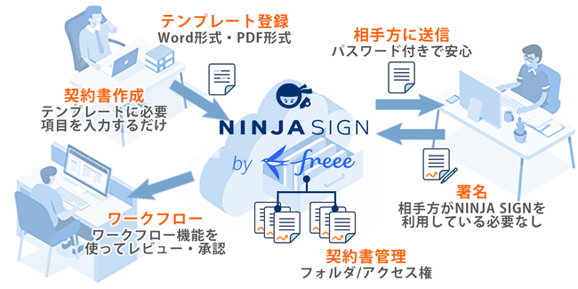 煩雑な【契約書作成依頼】【作成】【レビュー】【締結】【保管】といった一連の契約業務をオンライン上で行えるワンストップ電子契約サービス「NINJA SIGN by freee」。不要な操作を一切無くし、“ニンジャ”のようにスピーディーな動作を実現、契約業務を影から支えます。また、必要機能に合わせた定額プランを5種用意し、低コストで導入・利用が可能です。
