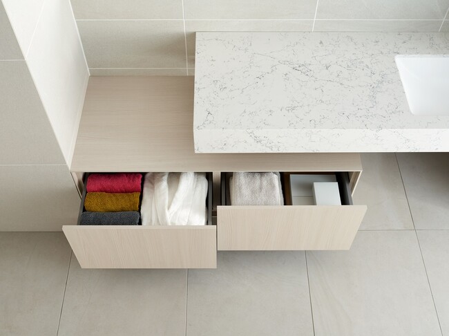 《ピッタラドロワー》は、お客様からのご要望の多かった引出し仕様で、洗面やリビングで散らかりがちな小物の収納場所として活躍します。高さ400・600mmタイプは洗剤や詰め替え用品が収まるサイズ、高さ200mmはティッシュやドライヤーが収まるサイズとしました。