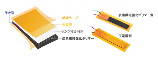 本研究グループは、振動を電気エネルギーに変換する鉛フリー圧電材料「ニオブ酸カリウムナトリウム(KNN)」をエポキシ樹脂に組み込み、CFRPに積層した独自構造の自己発電材料を開発(下図参照)。無線送信機等と組み合わせることで、検証環境下においてCFRPの損傷(亀裂進展)を「電波送信間隔」から定量的に読み取ることに成功しました。これは、外部電源を必要とせず、材料固有の力学応答のみで損傷検知が可能となることを示す画期的な成果です。
