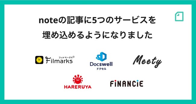 メディアプラットフォームnoteでは、映画レビューサービス「Filmarks(フィルマークス)」、スライド共有サービス「ドクセル」、カジュアル面談プラットフォーム「Meety」、マジック:ザ・ギャザリング専門店「晴れる屋」、新世代クラウドファンディングサービス「FiNANCiE」の5つのサービスを記事内に埋め込み表示できるようになりました。