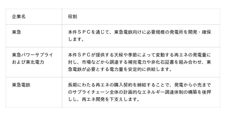 本取り組みでは、電源調達と需給運用に関する実績・知見を有する東北電力株式会社(以下、東北電力)と、東急線沿線を中心に地域に根差した電気サービスを提供する株式会社東急パワーサプライ(以下、東急パワーサプライ)が共同で電力供給を行います。