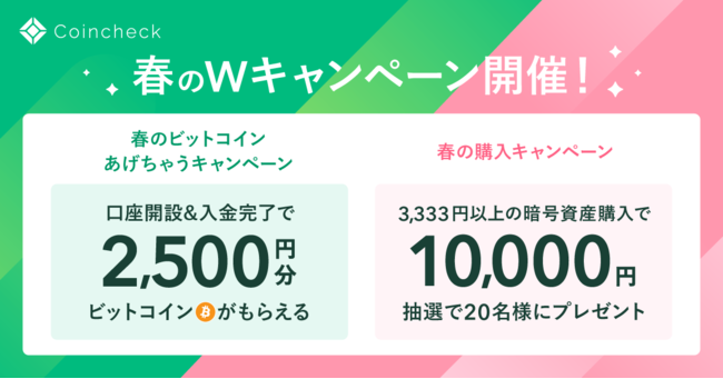 コインチェック株式会社(本社:東京都渋谷区、代表取締役:蓮尾 聡)の提供する暗号資産取引サービス「Coincheck」では、本日より本人確認(口座開設)や暗号資産の購入でビットコインがもらえる春の2大キャンペーンを実施いたします。