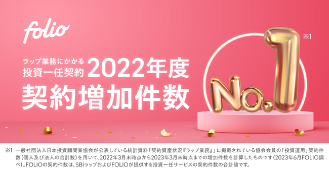 AI(人工知能)を活用したロボアドバイザー「AI投資 ROBO PRO(以下ROBO PRO)」および株式会社SBI証券(本社:東京都港区、代表取締役社長:高村正人、以下:SBI証券)と共同開発した「SBIラップ」を提供する株式会社FOLIO(本社:東京都千代田区、代表取締役CEO:甲斐 真一郎、以下:FOLIO)が、ラップ業務にかかる投資一任契約で、2022年度通期において契約増加件数第1位※1となったことをお知らせします。