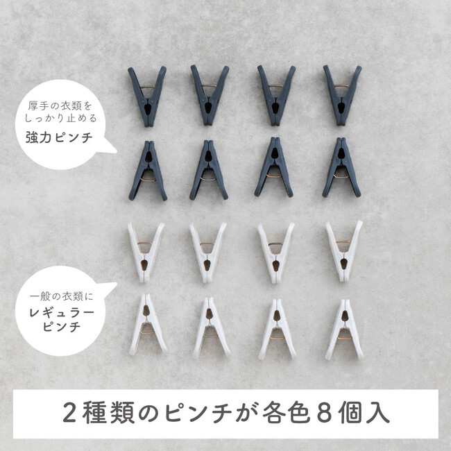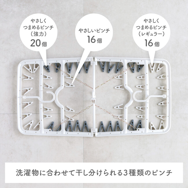 一般衣類向けレギュラーピンチ16個、厚物衣類向け強力ピンチ20個、デリケートな衣類向けのやさしいピンチ16個、合計52個のピンチで干し分けできます。破損したピンチが簡単に交換できるだけでなく、用途に合わせてピンチの組み合わせも自由自在です。