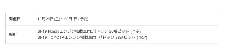Hondaエンジン搭載車両・TOYOTAエンジン搭載車両、2台のSF19による、初の同時デモランを10月28日(日)のピットウォーク中に実施いたします。