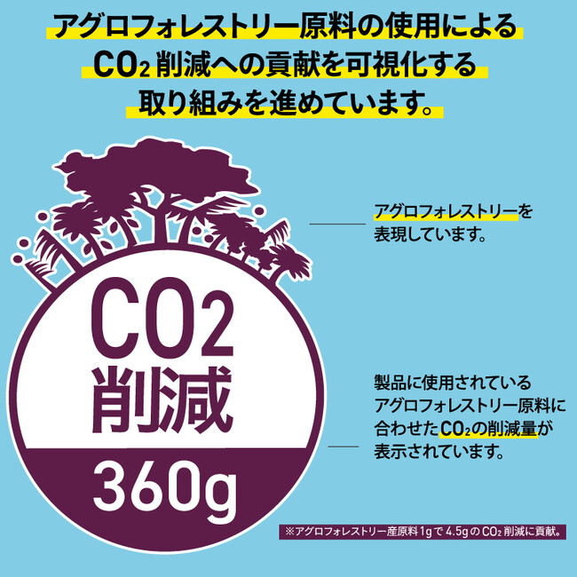 おもにアグロフォレストリーで栽培されたアサイーを使用しており、1製品当たり(2食分)360gのCO2削減に貢献できます。