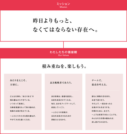 当社の企業理念である「ミッション」、「わたしたちの価値観」、「行動指針」を活用し、企業価値向上に努めて参ります。