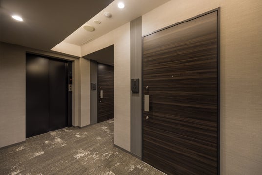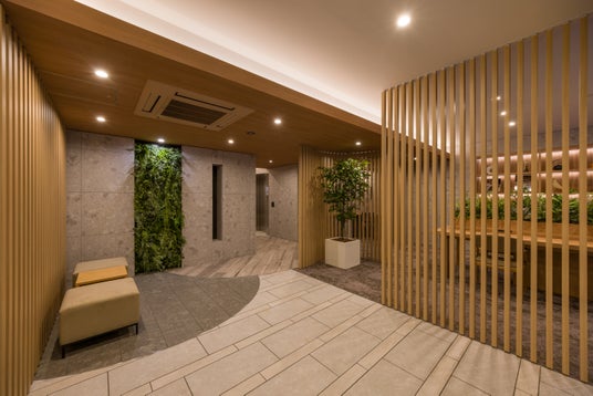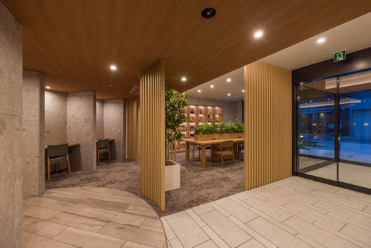1階には外部からの視認性のあるエントランスラウンジを設け、木調デザインを取り入れることで、建物内外からぬくもりを感じられる空間に仕上げました。また無料Wi-Fiと室内空調を完備した入居者様専用のビジネスラウンジを設けています。ビジネスラウンジには、個別ブースを2か所、ゆとりあるワークスペースを4席ご用意。仕事や作業、読書など、日常に寄り添うサードプレイスとして、多様なシーンでご利用いただけます。建物内共用部は全フロア、ホテルライクな内廊下仕様です。専有部は、洗面化粧台に上質な家具を思わせる「モビリスタ フロート」※を一部住戸に初採用しました。また、1DK住戸には可動式収納棚「シューノ19」を採用。収納にもデスクにもなるフレキシブルな設えにより、入居者様の好みでカスタマイズ可能な居室を提案します。