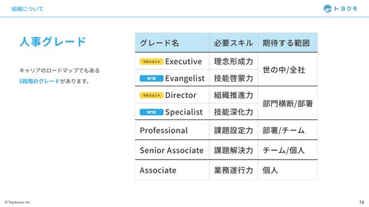 グレードは5段階の『Executive/Director』『Evangelist/Specialist』『Professional』『Senior Associate』『Associate』の5つで構成されています。